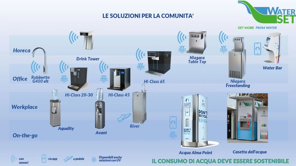 - Acqua sempre sana e controllata: Gli impianti Water Set garantiscono la più alta qualità dell’acqua, grazie a filtri avanzati, sistemi di sanificazione automatica e dispositivi ad ozono che eliminano batteri e virus dalle linee.